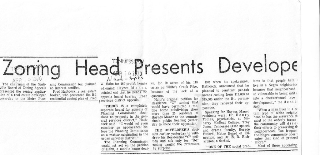 On April 16, 1970, The Tennessean reported that 25 Haynes Manor residents at a Metro Planning Commission meeting opposed a developer’s effort to build a mobile home park nearby. Speakers included a Meharry Medical College psychiatrist, a TSU faculty member, a member of the Metro Board of Education and a dentist.