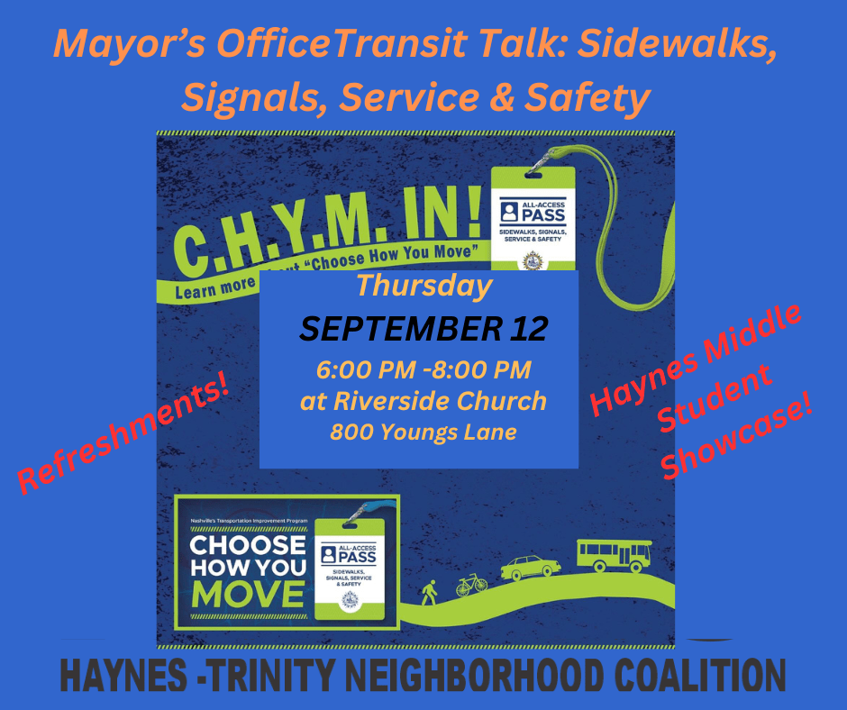| Who We Are: We are Haynes-Trinity area neighbors, faith-based institutions, and non-profits that serve our community. The Coalition advocates for our existing historic neighborhoods and we actively participate in the revitalization of the West Trinity Lane corridor. We work with all stakeholders including businesses, developers and elected officials to ensure our community remains welcoming, diverse and that everyone has a seat at the table. Coalition members are Beech Creek Missionary Baptist Church, Born Again Church, Brooklyn Heights, Chateau Valley, Haynes Manor, Haynes Heights, Hillmore, Lock One Park, The New Life Center, Resha Heights, Riverside Nashville Church, Bordeaux North Nashville Community PTA, Trinity Hills, and the Bordeaux North Nashville Chamber of Commerce. |